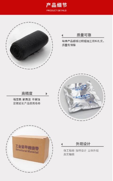 工業裝甲纏繞帶密閉于鋁塑復合袋中,即開即用,使用時無需特殊設備,只要簡單地將繃帶?于水中數秒,然后纏繞成形,即可在10分鐘內完成固化承重,18小時后則能體現完美的機械防護性能。